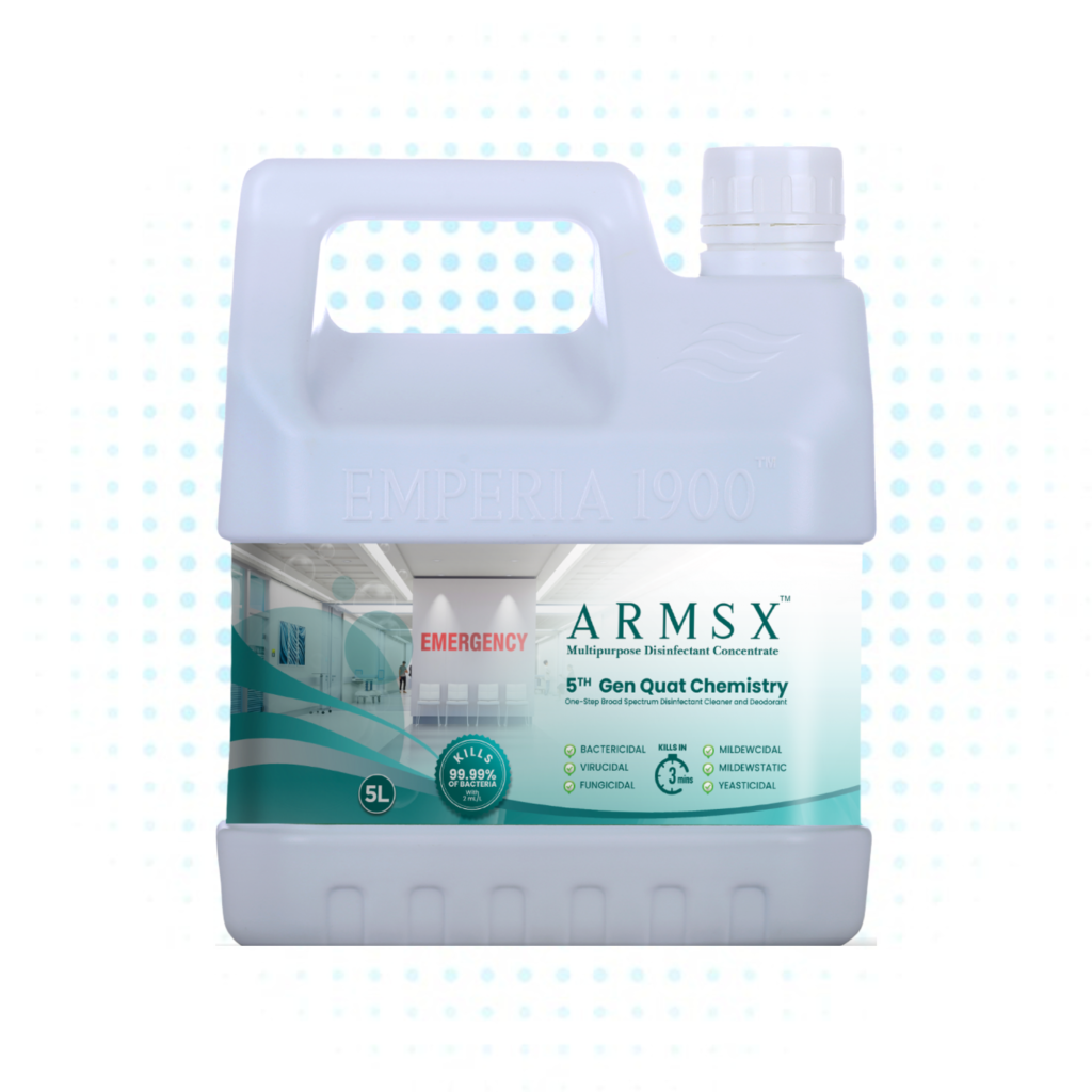 ARMSX is a Broad Spectrum, no-rinse, hard surface disinfectant cleaner and deodorant. It is based on 5th Generation Quat Chemistry and kills 99.99% of bacteria at a low concentration (2mL/L) within just 3 minutes of contact time.